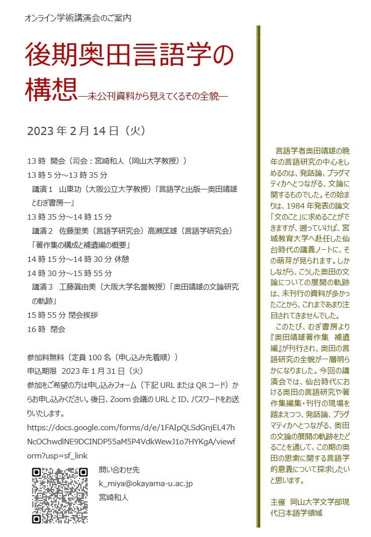 国立大学法人岡山大学(本部:岡山市北区、学長:槇野博史)の文学部は、2023年2月14日(火)に現代日本語学領域学術講演会「後期奥田言語学の構想-未公刊資料から見えてくるその全貌-」をオンラインで開催します。