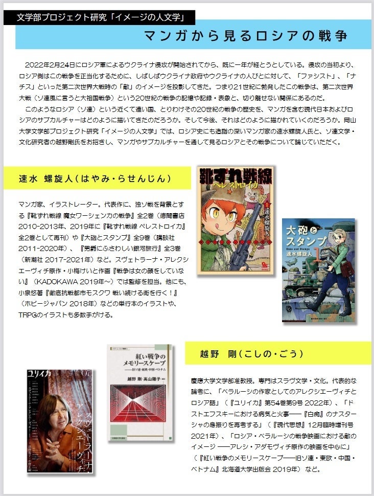 このようなロシア(ソ連)という近くて遠い国、とりわけその20世紀の戦争の歴史を、マンガを含む現代日本およびロシアのサブカルチャーはどのように描いてきたのだろうか。そして今後、それはどのように描かれていくのだろうか。岡山大学文学部プロジェクト研究「イメージの人文学」では、ロシア史にも造詣の深いマンガ家の速水螺旋人氏と、ソ連文学・文化研究者の越野剛氏をお招きし、マンガやサブカルチャーを通して見るロシアとその戦争について論じていただく。