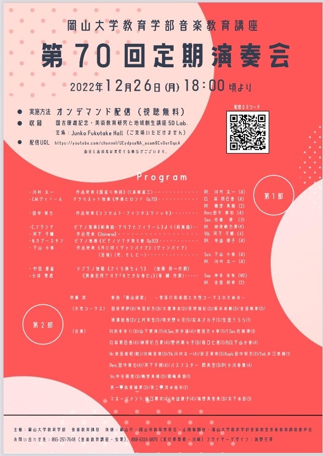 国立大学法人岡山大学(本部:岡山市北区、学長:槇野博史)の教育学部音楽教育講座では、2022年12月26日(月)に学生による演奏会を開催します。開催はYouTubeにて配信しますので、どなたでも視聴いただけます。