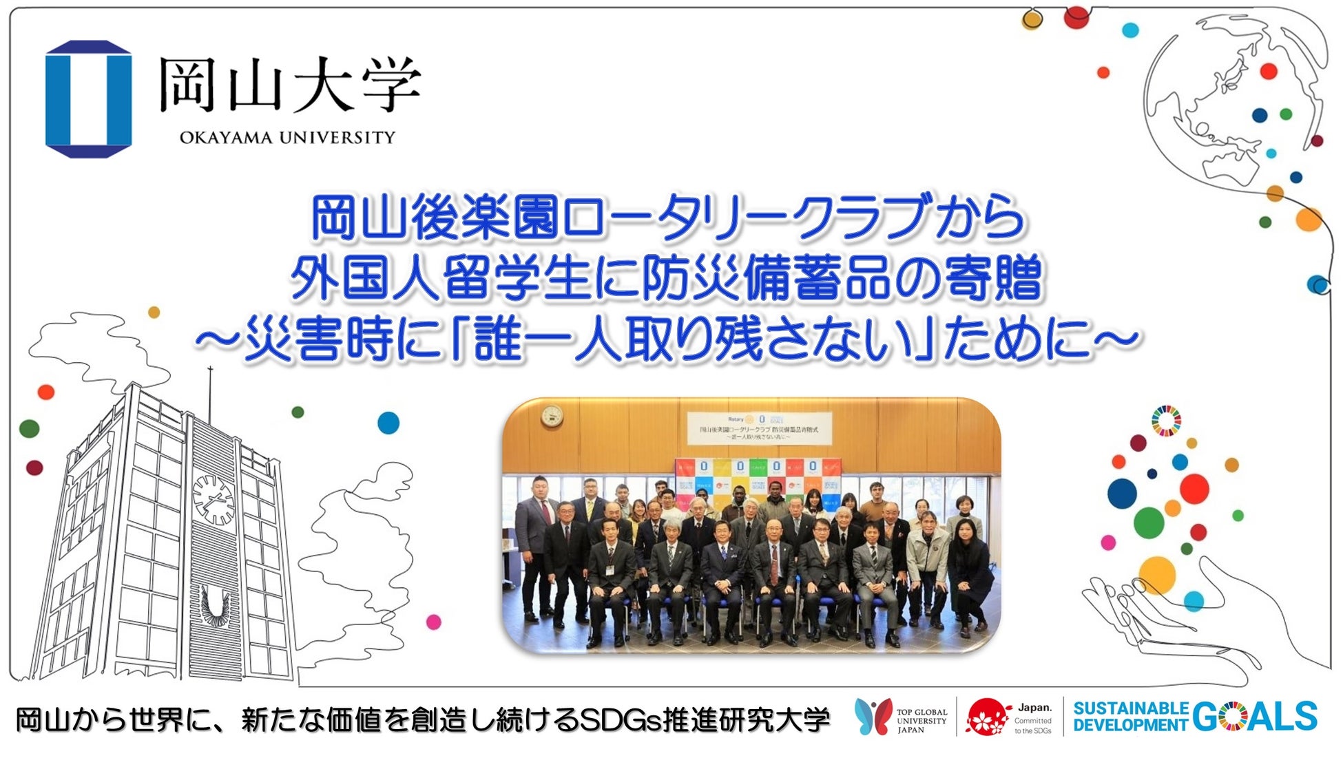 岡山後楽園ロータリークラブから、本学留学生のために防災備蓄品を寄贈していただける運びとなり、2022年12月15日に寄贈式を挙行し、留学生など約30人が参加しました。