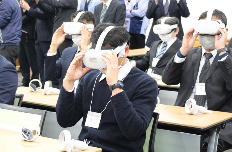 今回のセミナーでは、岡山県南東部の救急救命士28人が参加。最初にVR動画を視聴した後、人型のシミュレーターを使って、実際のエコー検査を体験してもらいました。岡山大学病院救命救急科および産科婦人科の医師が、シミュレーターに装置(プローブ)をあてて出血部位を確認する「FAST検査」についてレクチャーし、「プローブはダイナミックに動かすと良い」などとアドバイスしました。