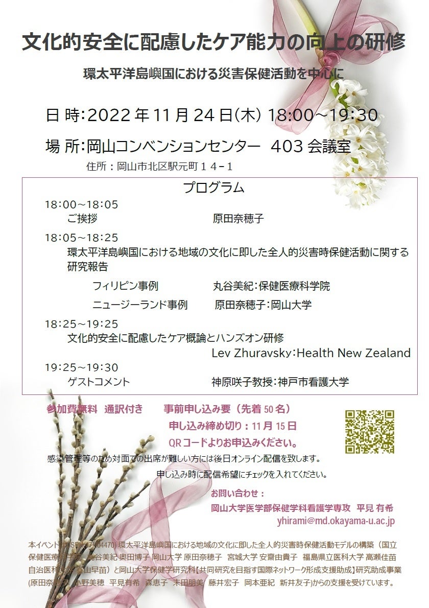 ・【岡山大学】文化的安全に配慮したケア能力の向上の研修 環太平洋島嶼国における災害保健活動を中心に〔11/24木, 岡山コンベンションセンター〕