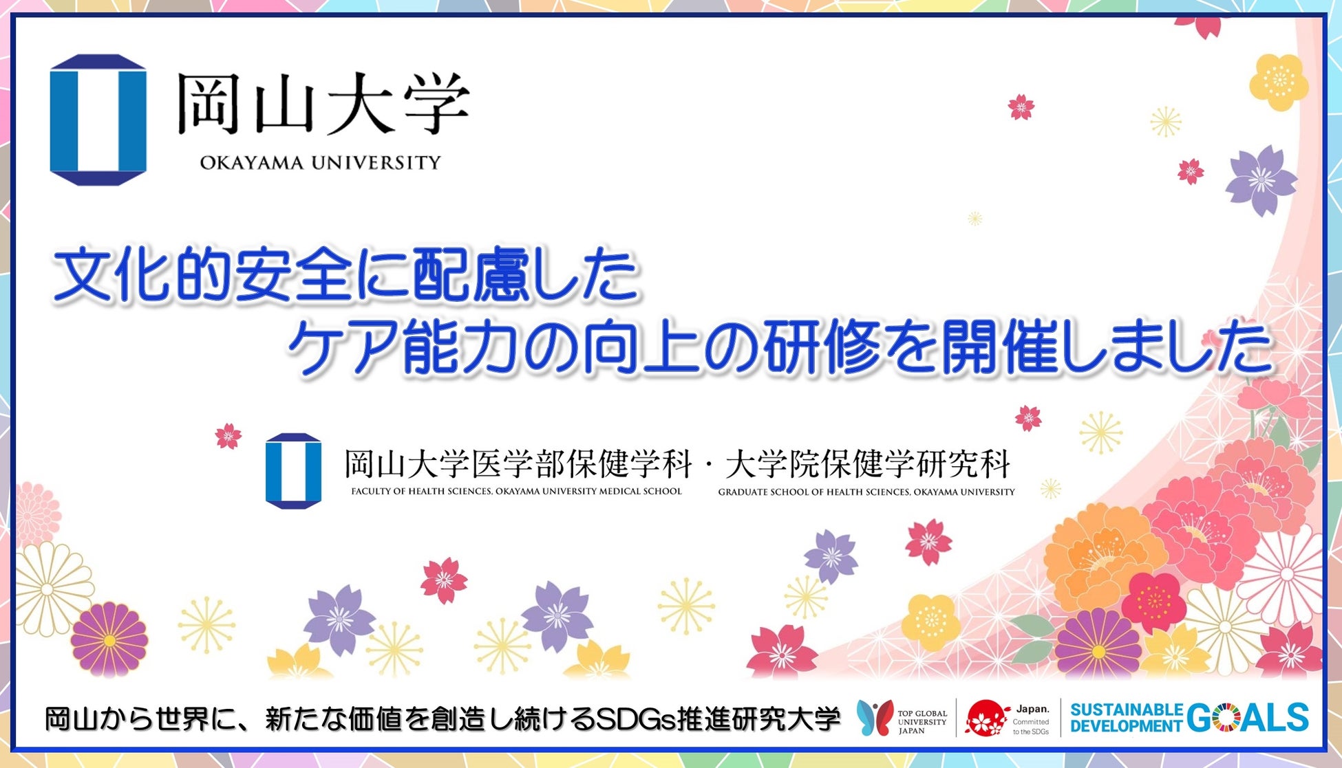 国立大学法人岡山大学(本部:岡山市北区、学長:槇野博史)の医学部保健学科・大学院保健学研究科は、2022年11月22日(於 本学保健学科棟セミナー室)・24日(於 岡山コンベンションセンター会議室)に「文化的安全に配慮したケア能力の向上の研修」を開催しました。