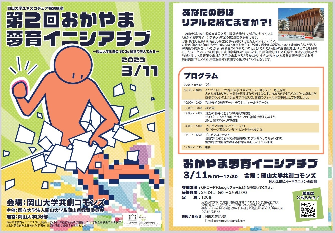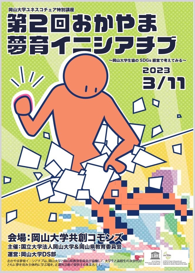 国立大学法人岡山大学(本部:岡山市北区、学長:槇野博史)と岡山県教育委員会が正課外活動として協働で行っている「おかやま夢育イニシアチブ」事業。第2回は「岡山大学生協のSDGs経営を考える」と題し、現実的な課題の定義の方法を学び、解決策の提案を行いながら、高校生の「やりたいこと」と「なりたい姿」の解像度を上げることを目的としたワークショップを、2023年3月11日(土)9:30~17:30に本学津島キャンパスの岡山大学共育共創コモンズ(愛称:OUX【オークス】)で開催します。