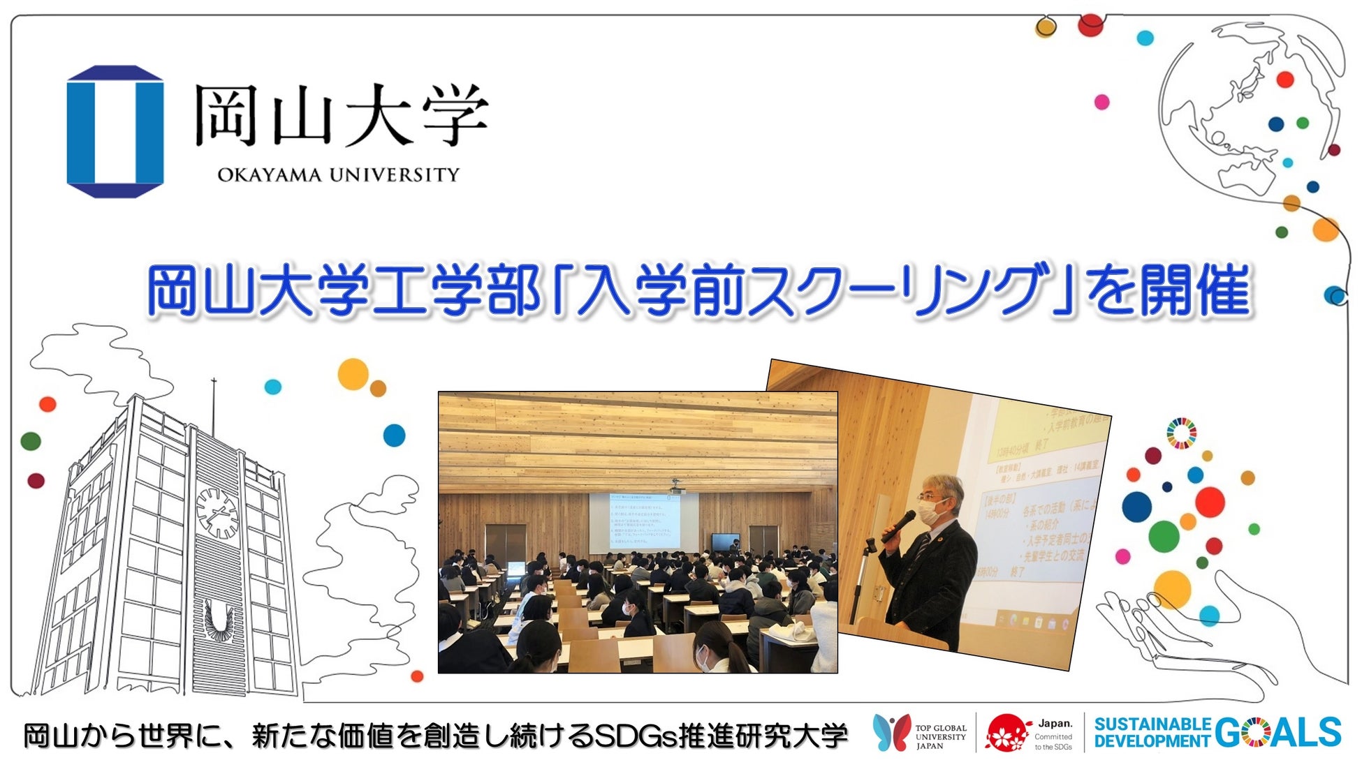 国立大学法人岡山大学(本部:岡山市北区、学長:槇野博史)の工学部は2023年2月5日、2023年度学校推薦型選抜Ⅰと国際バカロレア選抜(8月募集)の入学予定者(各入学者選抜の合格者で入学手続きを終えた者)に対して、入学前教育の趣旨説明や、入学予定者同士の交流の場として、入学前スクーリング*1を開催しました。