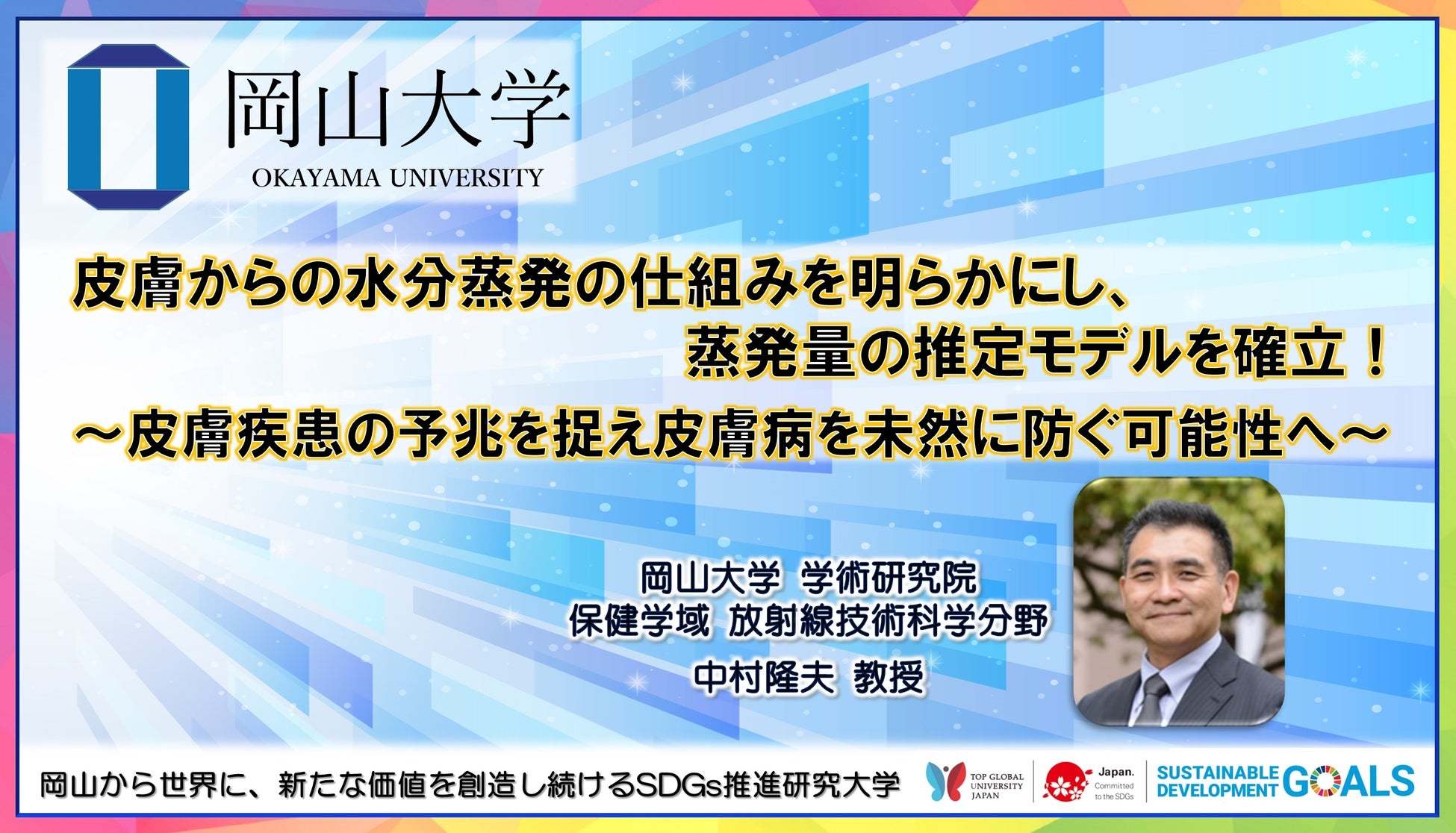 国立大学法人岡山大学(本部:岡山市北区、学長:槇野博史)学術研究院保健学域放射線技術科学分野の中村隆夫教授、楠原俊昌助教、アルケア株式会社(本社:東京都墨田区、代表取締役社長:伊藤克己、以下「アルケア」)の価値創造部に在籍する上原治(専門:生体計測技術)の共同研究グループは、皮膚機能のなかでも重要とされる「皮膚バリア機能」に注目し、皮膚バリア機能の定量的な評価の実現を目指して研究を進めております。