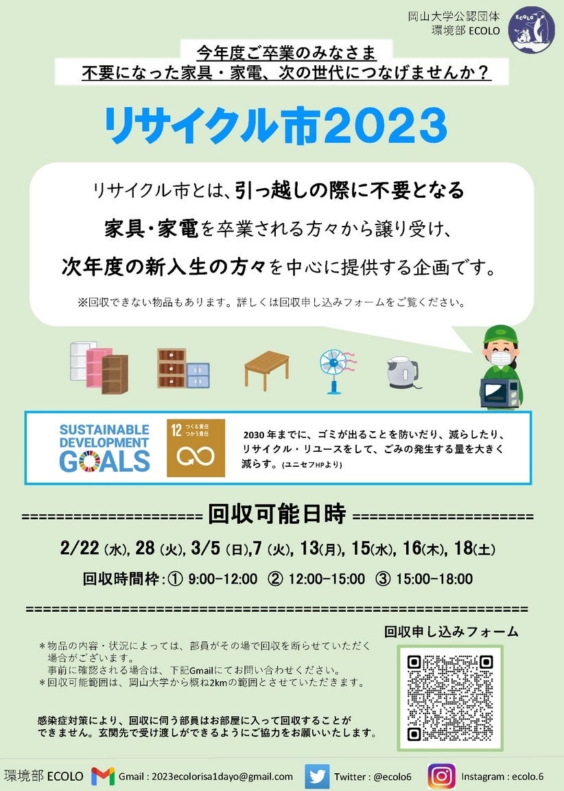 国立大学法人岡山大学(本部:岡山市北区、学長:槇野博史)の公認団体である環境部ECOLOが今年度も「リサイクル市2023」を開催します。