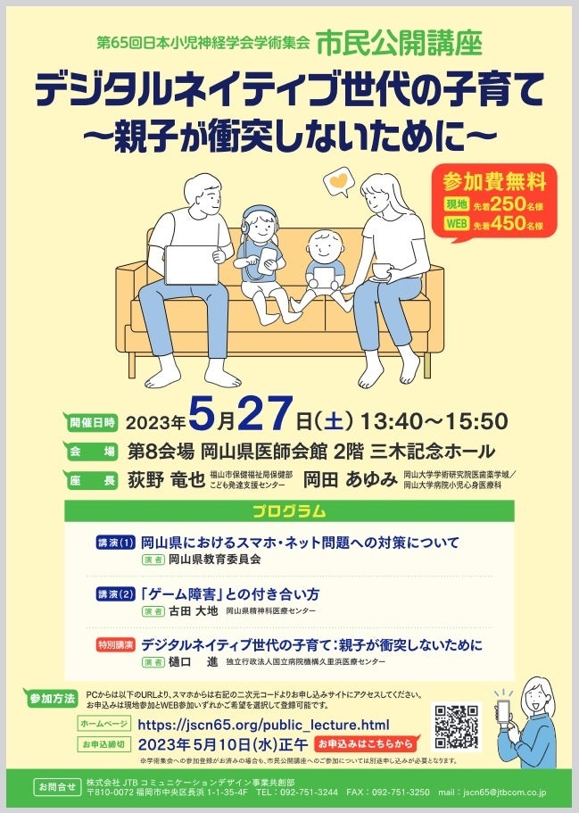 国立大学法人岡山大学(本部:岡山市北区、学長:那須保友)の岡山大学病院小児神経科では、「第65回日本小児神経学会学術集会」の取り組みのひとつとして、2023年5月27日(土)の岡山県医師会館三木記念ホールにおいて市民公開講座「デジタルネイティブ世代の子育て~親子が衝突しないために~」を現地とWEBのハイブリッド形式で開催します。