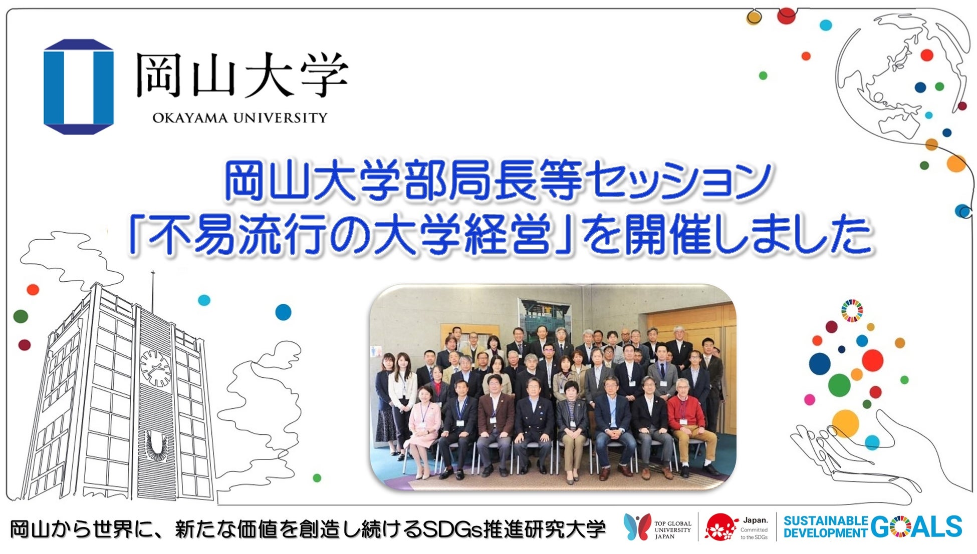 国立大学法人岡山大学(本部:岡山市北区、学長:槇野博史)は2023年3月11日、大学執行部並びに新任を含む各部局長等が一堂に会して、岡山大学の持続的発展を考える上で重要な事項について、現状の認識と今後の方向性を共有することを目的とした部局長等セッションを「不易流行の大学経営」をテーマに、岡山大学創立五十周年記念館(本学津島キャンパス)で開催しました。