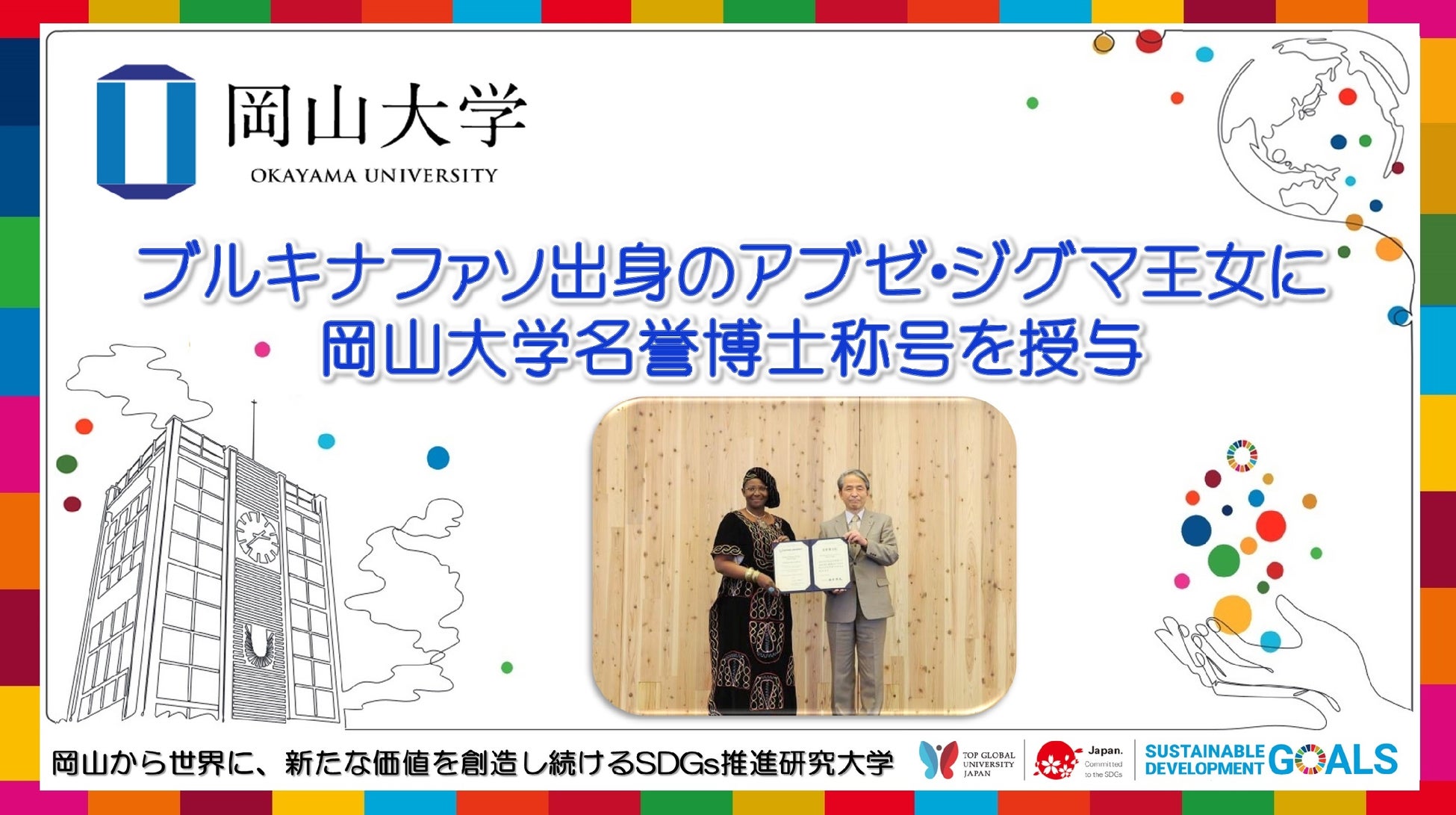 国立大学法人岡山大学(本部:岡山市北区、学長:槇野博史)は2023年2月22日、ブルキナファソ出身のアブゼ・ジグマ王女(Her Royal Highness Princess Abze Djigma)に岡山大学名誉博士の称号を授与しました。