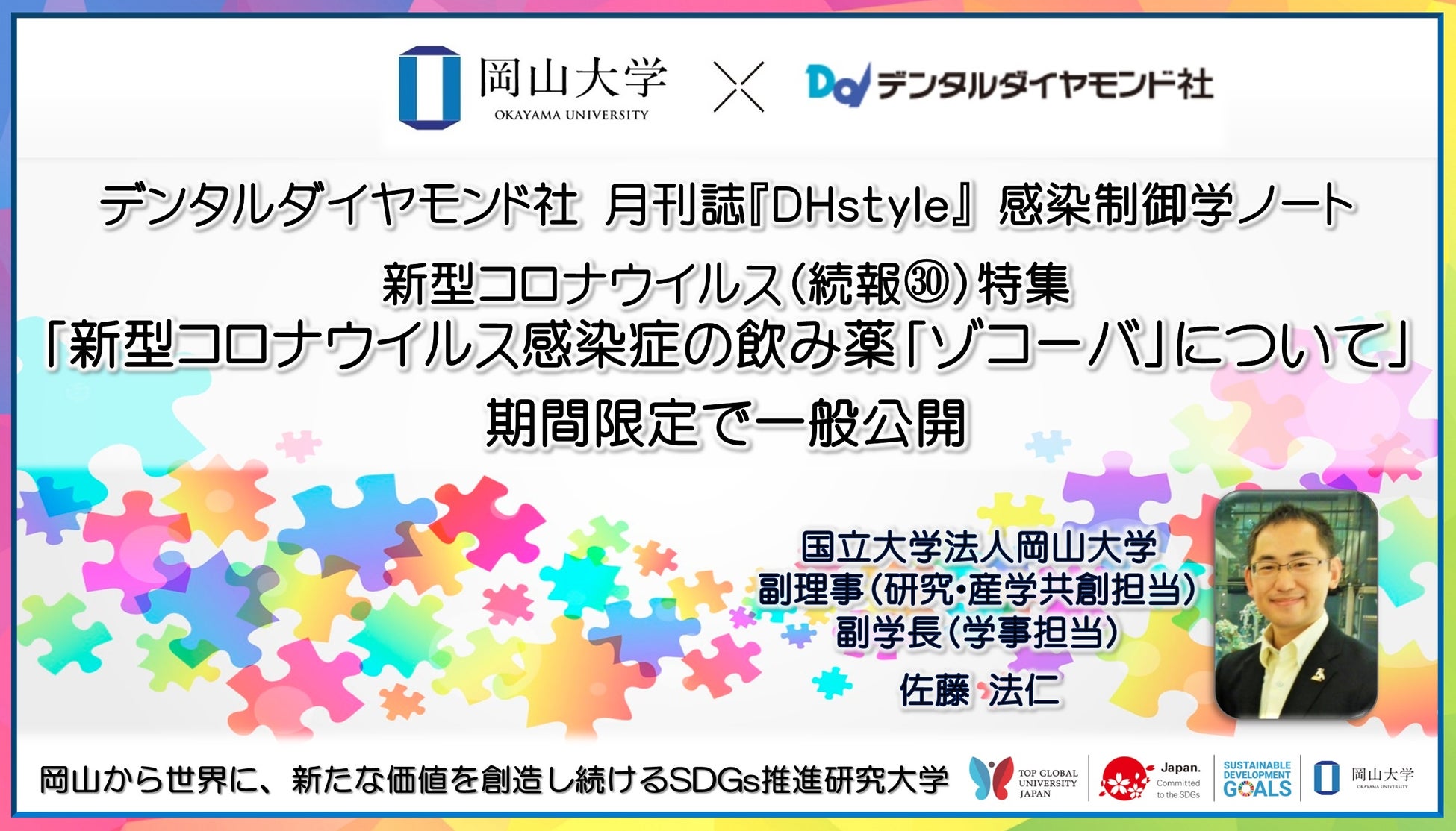国立大学法人岡山大学(本部:岡山市北区、学長:那須保友)東京オフィス駐在の佐藤法仁副理事(研究・産学共創総括担当)/副学長(学事担当)・URAは、歯科総合出版社である株式会社デンタルダイヤモンド社(本社:東京都文京区本郷、代表取締役:濵野優)が歯科衛生士向けに発行している月刊誌『DHstyle』に、連載「感染制御学ノート」を2012(平成24)年1月から行っています。