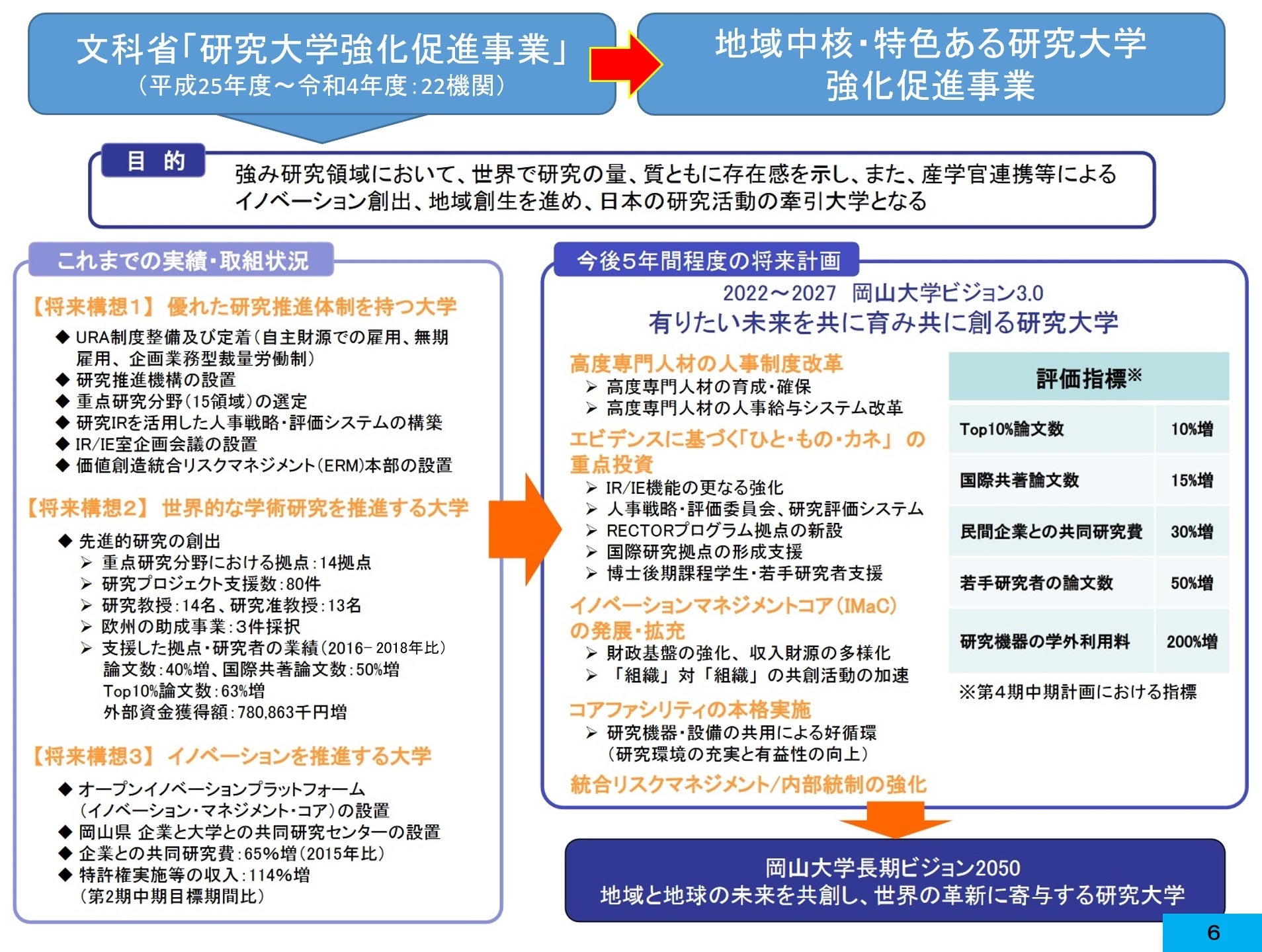 岡山大学は昨年度まで国が選定し、その選定大学を研究大学として運用してきた文部科学省の「研究大学強化促進事業」の選定機関です。10年にもおよぶ長期事業において、研究人材の育成と拠点形成、さらにはそれを高度にマネジメントとするURA(リサーチ・アドミニストレーター)とサポート組織の整備強化等を戦略的かつ精力的に実施してきました。その結果、論文指標の大きな伸びだけではなく、海外の秀逸な研究者集団(アカデミック・マフィア)との連携や海外事業獲得による共同研究などを実施するなど、世界に開かれた「研究大学:岡山大学」として成長してきました。それらの取組は文部科学省の研究大学強化促進事業(事業最終評価)の会合でも認められ、最高評価の「S評価」を得ています。