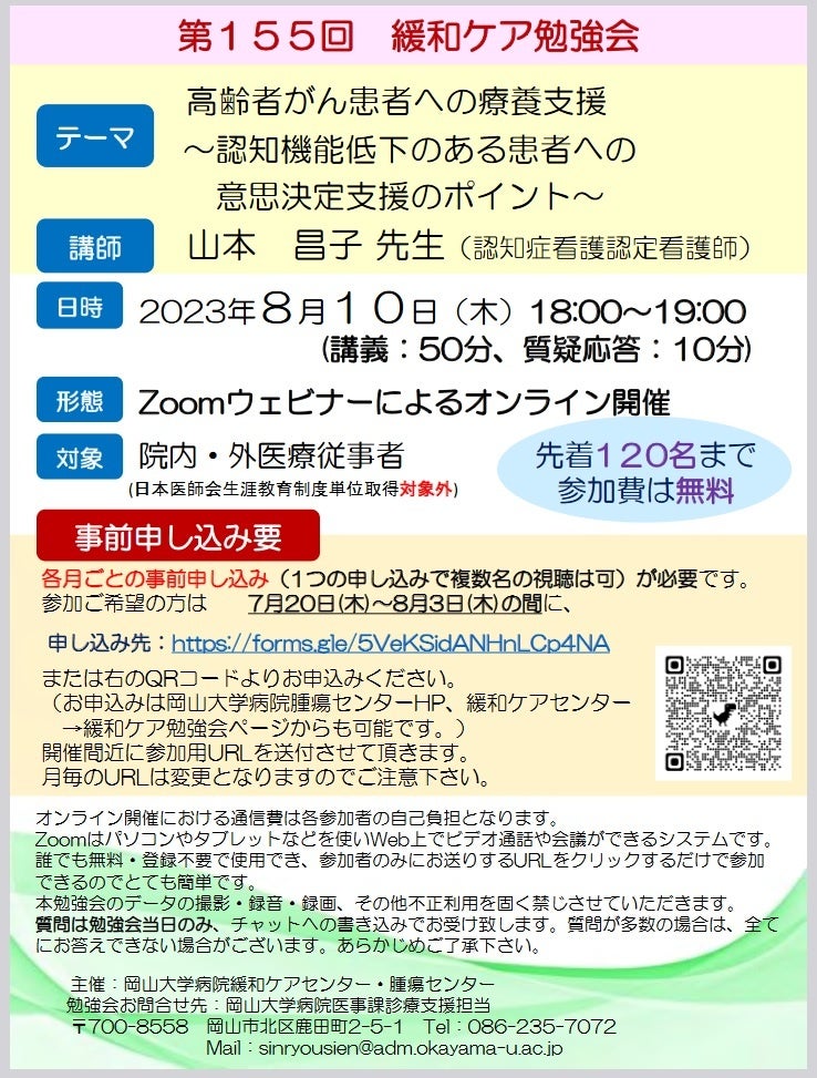 下記の岡山大学ホームページ公開講座(講座No.7)からWEBのお申込みをお願いします。
