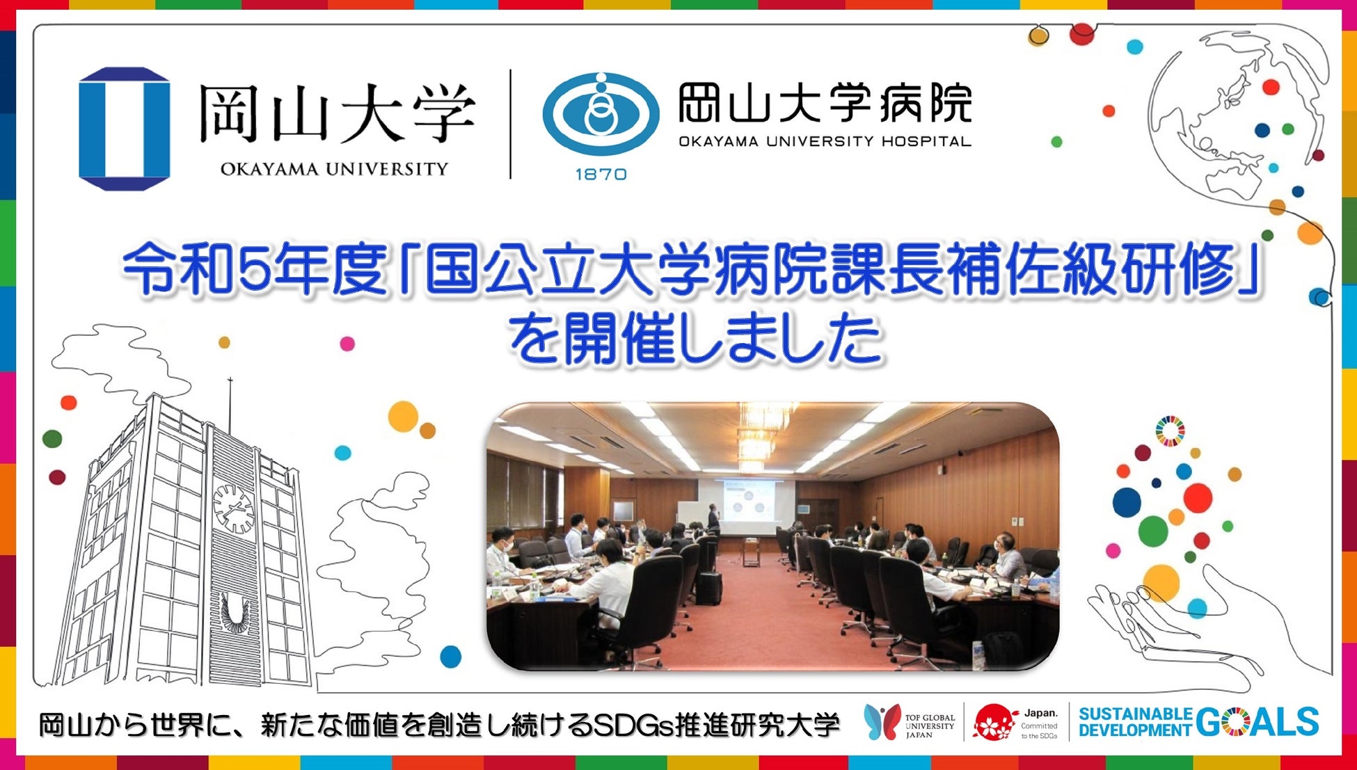 国立大学法人岡山大学(本部:岡山市北区、学長:那須保友)は、2023年6月12、13日の2日間、岡山大学の当番により、令和5年度国公立大学病院課長補佐級研修を、本学鹿田キャンパスの岡山大学病院の大会議室にて開催し、全国から国公立大学病院の課長補佐級の職員計24人が出席しました。