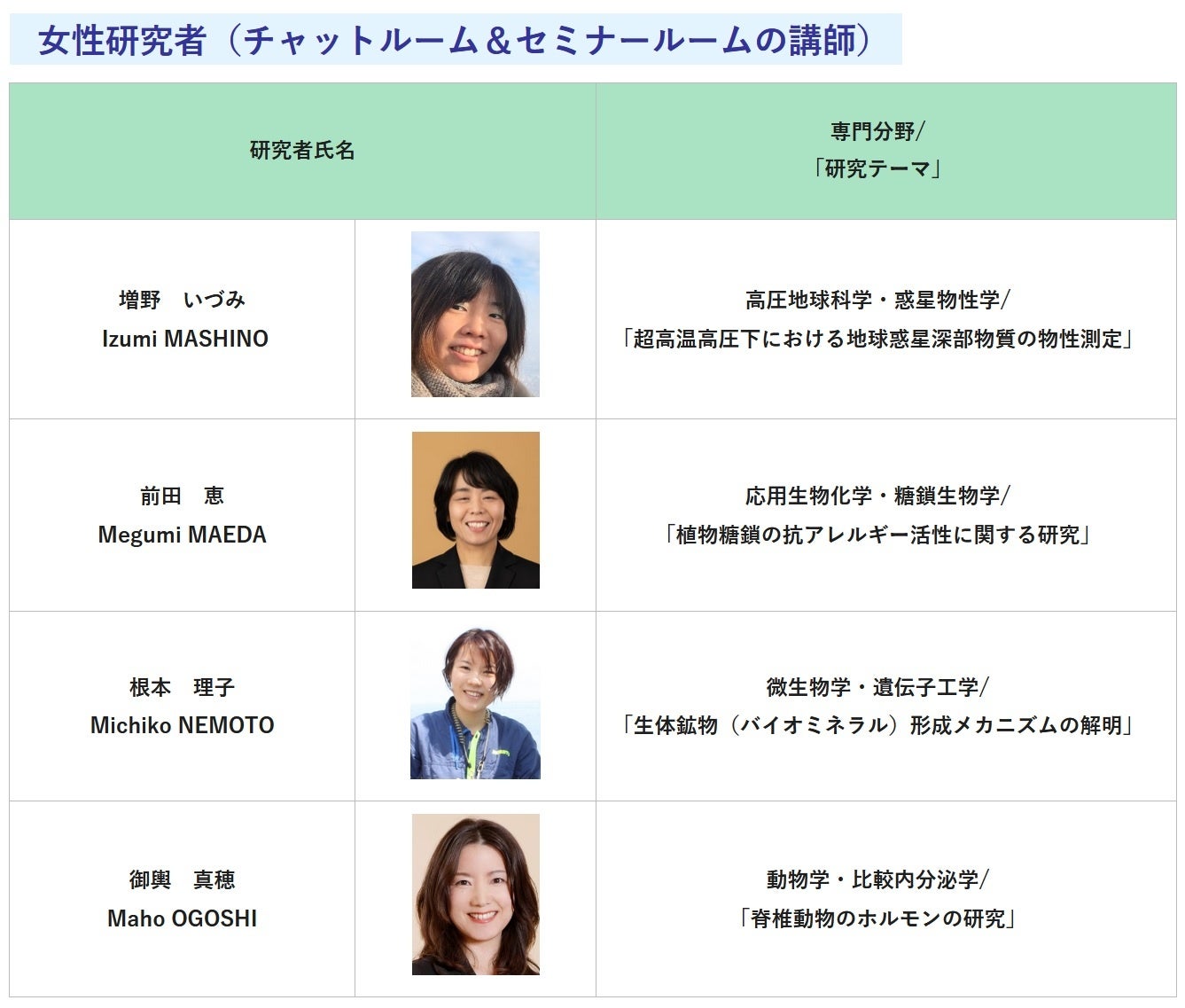 女性研究者4名がみなさんの質問にライブ配信でお答えします。「数学が苦手です・・」「学生時代の勉強方法は?」「大学の研究者ってどんなことをしているの?」などの質問にお答えします。