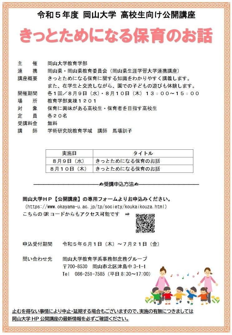 国立大学法人岡山大学(本部:岡山市北区、学長:那須保友)の教育学部では、2023年8月9日(水)と10日(木)の各1回、13:00~15:00に公開講座「きっとためになる保育のお話」を本学津島キャンパスの教育学部東棟1201で開催します。