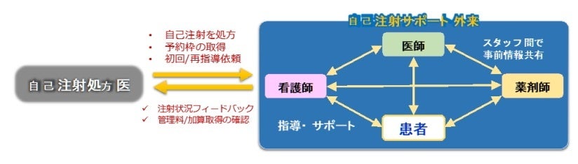 今回設置した「自己注射サポート外来」では、自己注射の指導が可能な看護師、薬剤師を配置し、自己注射処方医からの依頼を受けて、自己注射の導入や継続における指導とサポートを行います。