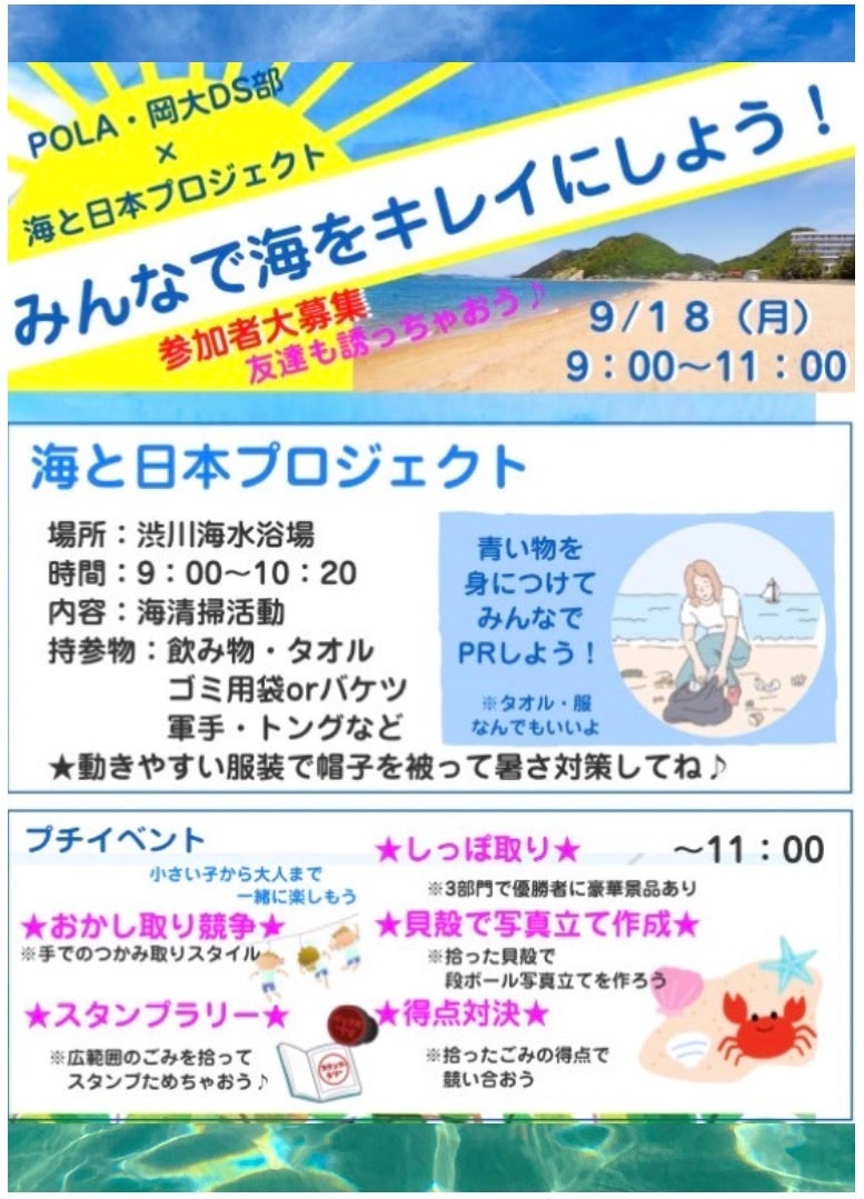 この度、株式会社ポーラと岡山大学公認サークル「岡山大学データサイエンス(DS)部」は、2023年9月18日に岡山県玉野市の渋川海岸において、みんなで海をきれいにし、自然と触れ合う「海と日本プロジェクト」を企画・開催します。両者が共同して同プロジェクトを行うのは今回が初めてです。