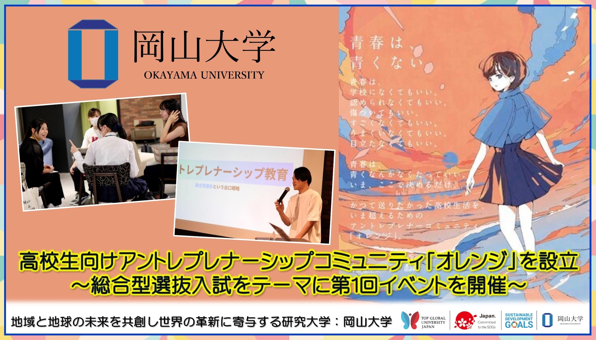 国立大学法人岡山大学(本部:岡山市北区、学長:那須保友)は、2023年10月1日、NPO法人だっぴ、無花果株式会社と連携し、高校生向けアントレプレナーシップ(起業家精神)コミュニティ「オレンジ」を設立しました。