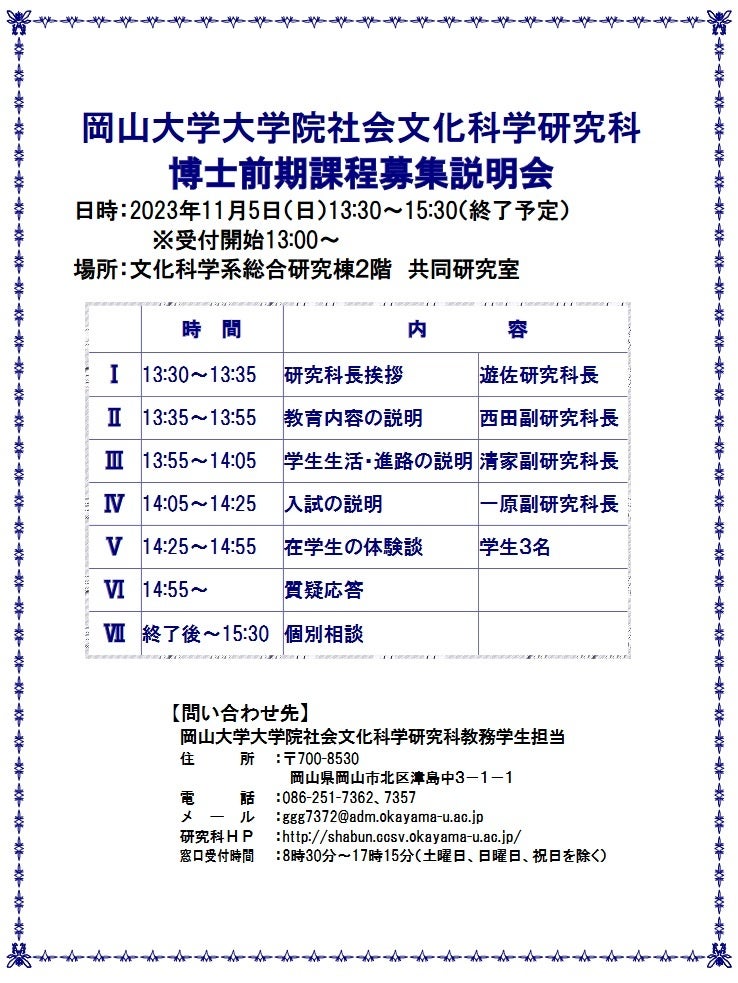 国立大学法人岡山大学(本部:岡山市北区、学長:那須保友)の大学院社会文化科学研究科(博士前期課程)は、今後大学院への進学を目指す方・受験を考えている方に本研究科の教育内容や入試の説明等を広く周知することを目的として、2023年11月5日(日)に「募集説明会」を本学津島キャンパスの文化科学系総合研究棟2階共同研究室で開催します。