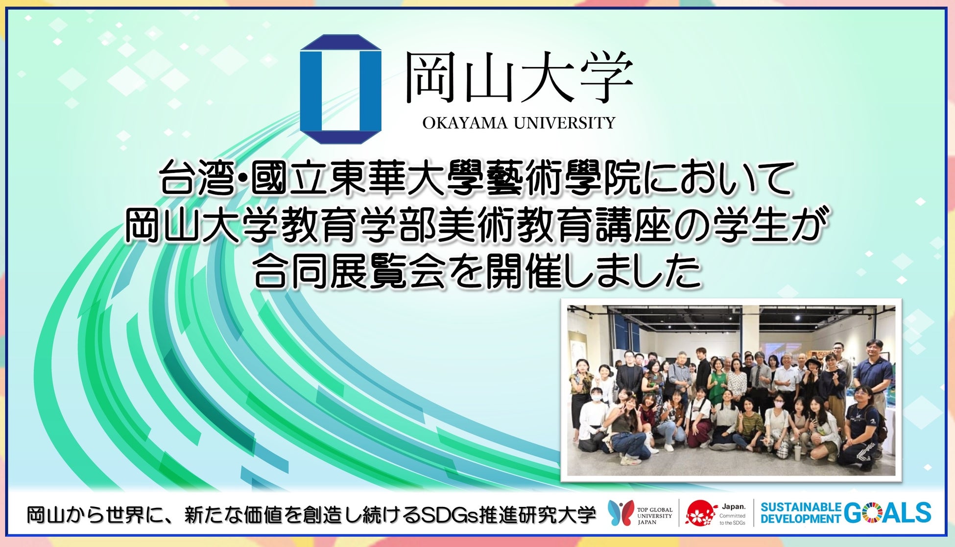 国立大学法人岡山大学(本部:岡山市北区、学長:那須保友)は、2023年9月17日~20日にかけて、台湾・花蓮市の國立東華大學藝術學院にて同大の学生・大学院生と、本学教育学部美術教育講座及び大学院教育学研究科教育科学専攻の学生・大学院生による初の合同展覧会を開催しました。