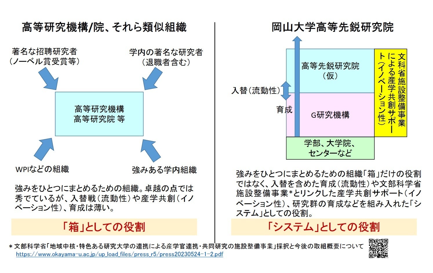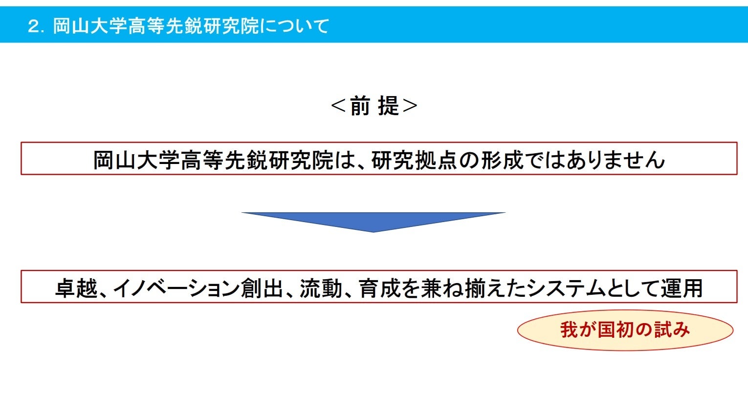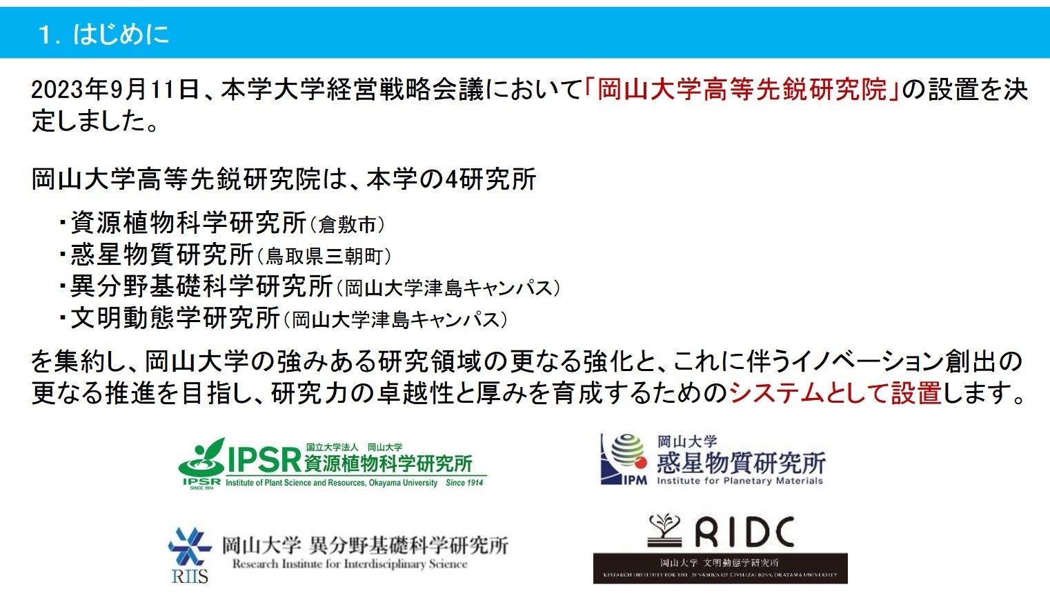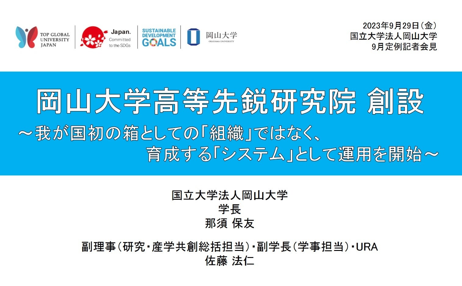 本件は、2023年9月29日に開催された「岡山大学9月定例記者会見」の学長発表「岡山大学高等先鋭研究院 創設~我が国初の箱としての「組織」ではなく、育成する「システム」として運用を開始~」において、詳細な説明がおこなわれました。