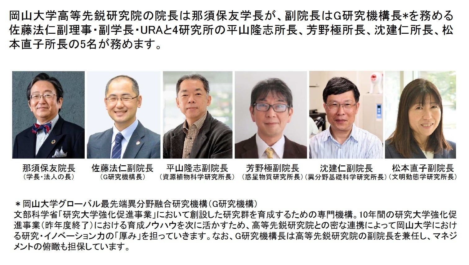 今回の創設について、院長を務める那須学長は「岡山大学高等先鋭研究院の創設は研究拠点の形成ではありません。既存のG研究機構等との連携によって、トップ研究群の卓越性といずれそれを担う次世代研究群の育成による”厚み”を形成するシステムとして機能します。またこれまで学内の研究者らは、自分たちの研究をどのように大きくしていくかが明確ではありませんでした。今回のシステムは、まず目指す方向として重点研究分野を担う育成ステージであるG研究機構に入れるように研究チームを育成する。そのためのサポートを研究推進機構やIMaCが実施する。基準を満たした後は、次のステージである最重点研究分野を担う高等先鋭研究院を目指す。高等先鋭研究院では、先鋭研究群等にて卓越性をさらに磨くという、サッカーで例えるならばJ1、J2のような階層とそれを育成支援する総合的なシステムを構築しました。このシステムでは、研究IRによる客観的な評価に基づき、高等先鋭研究院とG研究機構での研究群の入れ替えもあり得ますし、基準を満たさなければどちらにも在籍できない、という流動性を持たせています。研究者らが切磋琢磨し、永続的に個人研究を実施するのではなく、研究群として戦略性を持って育成できる道筋をシステムとして明確にし、方向性を示しました。今後、総司令塔機能を担う研究推進機構などの強化を予定しており、全学を挙げてマネジメント・支援できる体制をさらに推進します。岡山大学は変わっていきます。引き続き、ご指導ご鞭撻のほど、よろしくお願い申し上げます」とコメントしました。