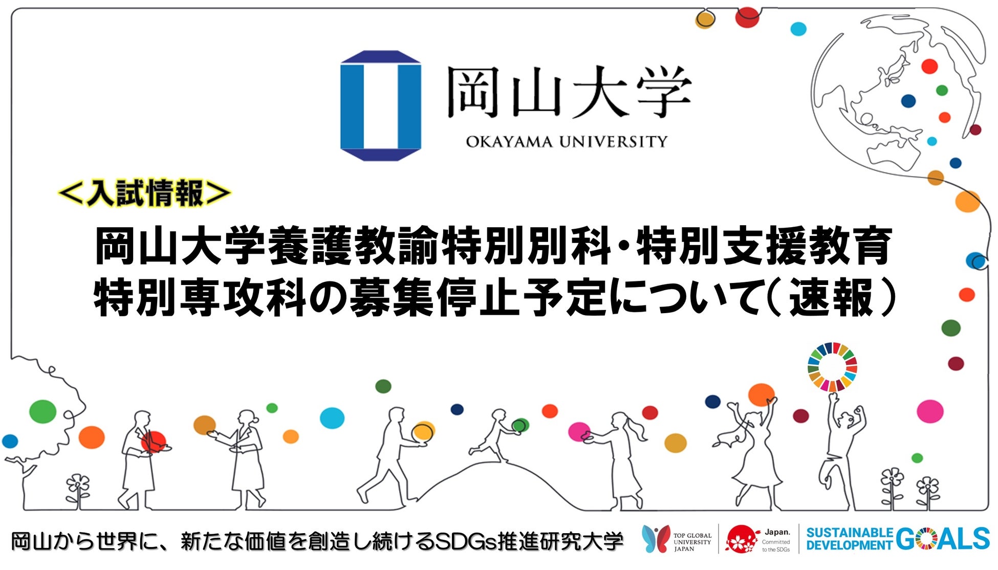 国立大学法人岡山大学(本部:岡山市北区、学長:那須保友)で実施している「養護教諭特別別科・特別支援教育特別専攻科」について、募集停止予定となりました。