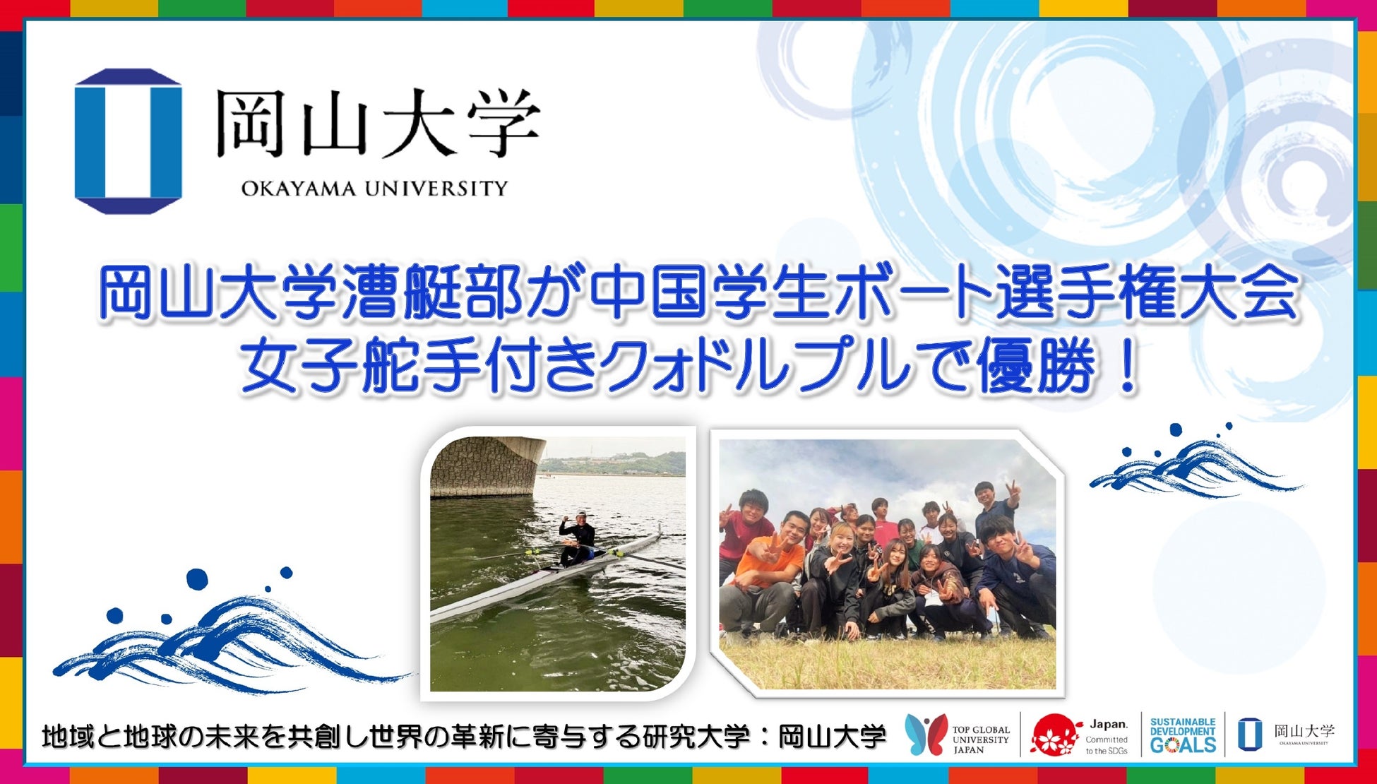国立大学法人岡山大学(本部:岡山市北区、学長:那須保友)の漕艇部が、2023年10月8日に広島県芦田川漕艇場(広島県福山市)で行われた第67回中国学生ボート選手権大会に出場し、女子舵手付きクォドルプルの部で優勝、男子シングルスカルの部、男子ダブルスカルの部で3位入賞という結果を収めました!