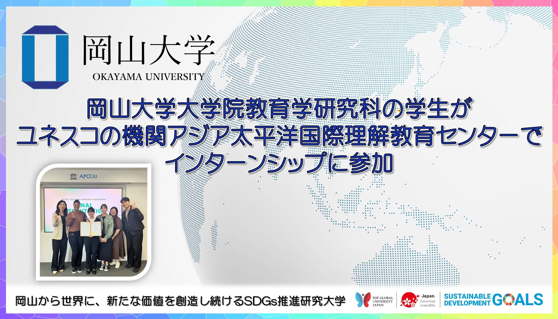 国立大学法人岡山大学(本部:岡山市北区、学長:那須保友)大学院教育学研究科教育科学専攻の大学院生3人が、韓国のソウルにある国連のユネスコの機関であるアジア太平洋国際理解教育センター(Asia-Pacific