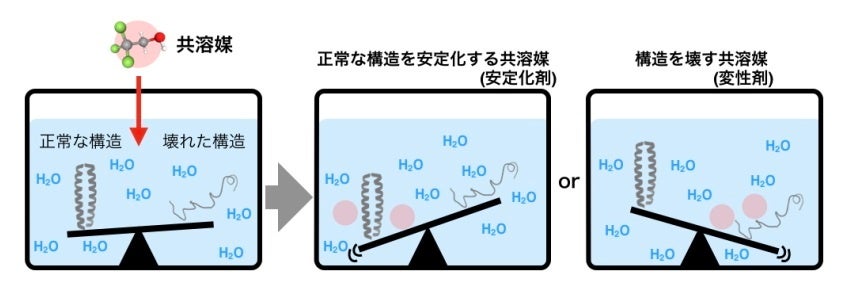図1. タンパク質の立体構造への共溶媒効果。タンパク質の正常な構造と壊れた構造は絶妙なバランスで保たれている。普通は正常な構造の方が、わずかに重みがある(比率が多くなる)ことをシーソーの絵で例えている。共溶媒によってどちらの構造に、どれくらいの重みがかかるかは共溶媒の種類によるが、その予測は困難である。