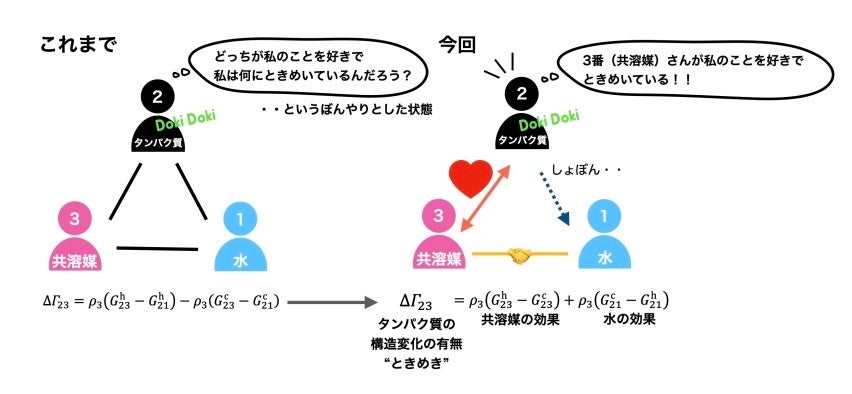 今回、タンパク質変性におけるタンパク質と水と共溶媒の「三角関係」を解く方法を考案しました。