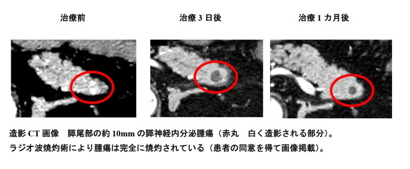 本治療は、局所切除の適応になる低悪性度かつ小径の膵神経内分泌腫瘍に対して行われ、これまでに行ってきたEUSガイド下エタノール注入療法より治療効果が高く、外科切除に代替される治療として期待されています。