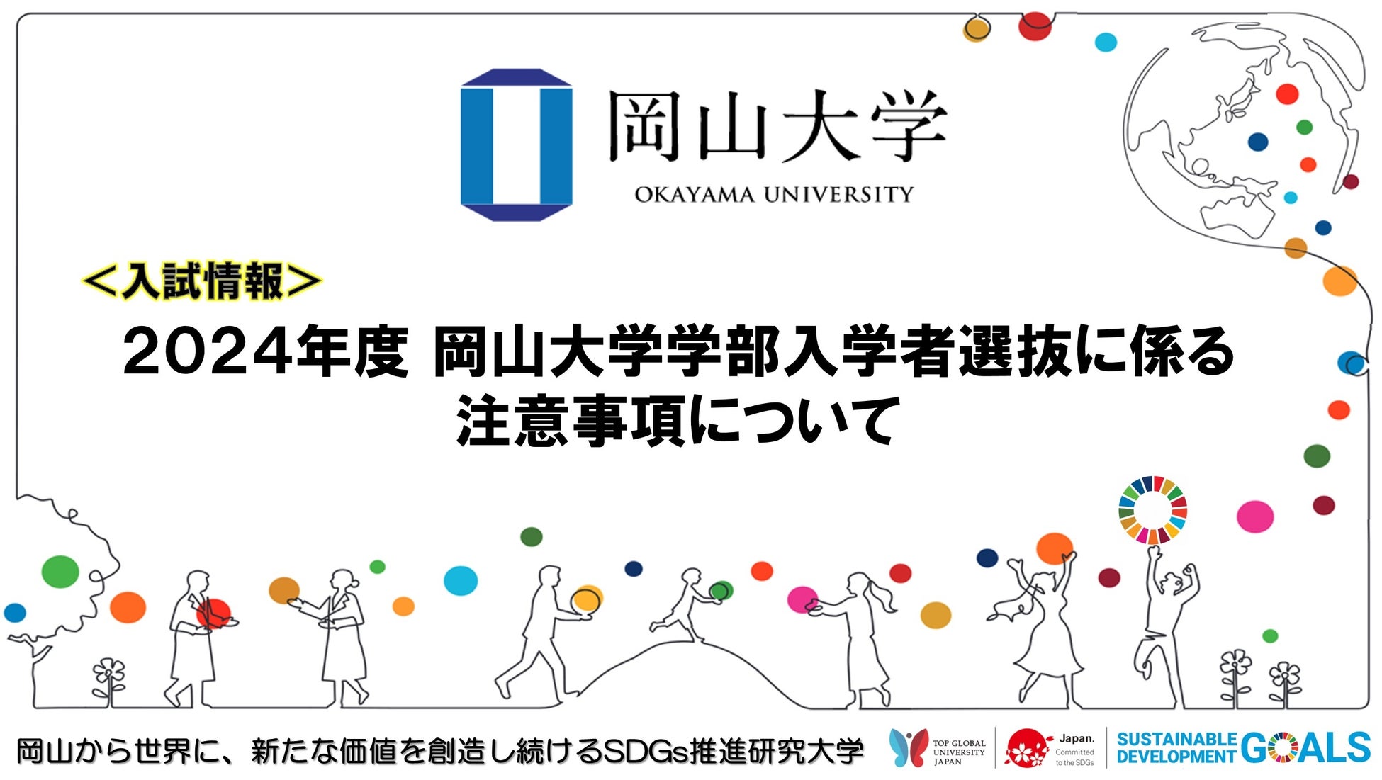 国立大学法人岡山大学(本部:岡山市北区、学長:那須保友)は、2024年度 岡山大学学部入学者選抜に係る注意事項について、以下のとおり、公開しましたのでお知らせします。