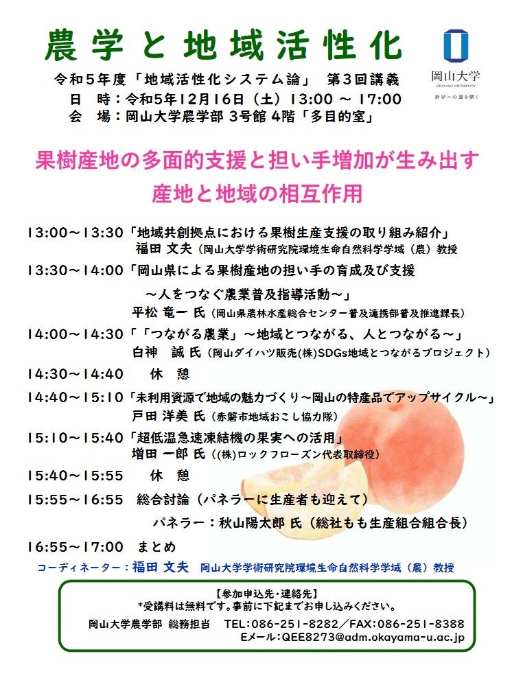 国立大学法人岡山大学(本部:岡山市北区、学長:那須保友)の農学部では、令和5年度「地域活性化システム論」を開催しており、第3回目を2023年12月16日(土)に、「果樹産地の多面的支援と担い手増加が生み出す産地と地域の相互作用」と題して、岡山大学津島キャンパスの農学部3号館4階「多目的室」で開催します。