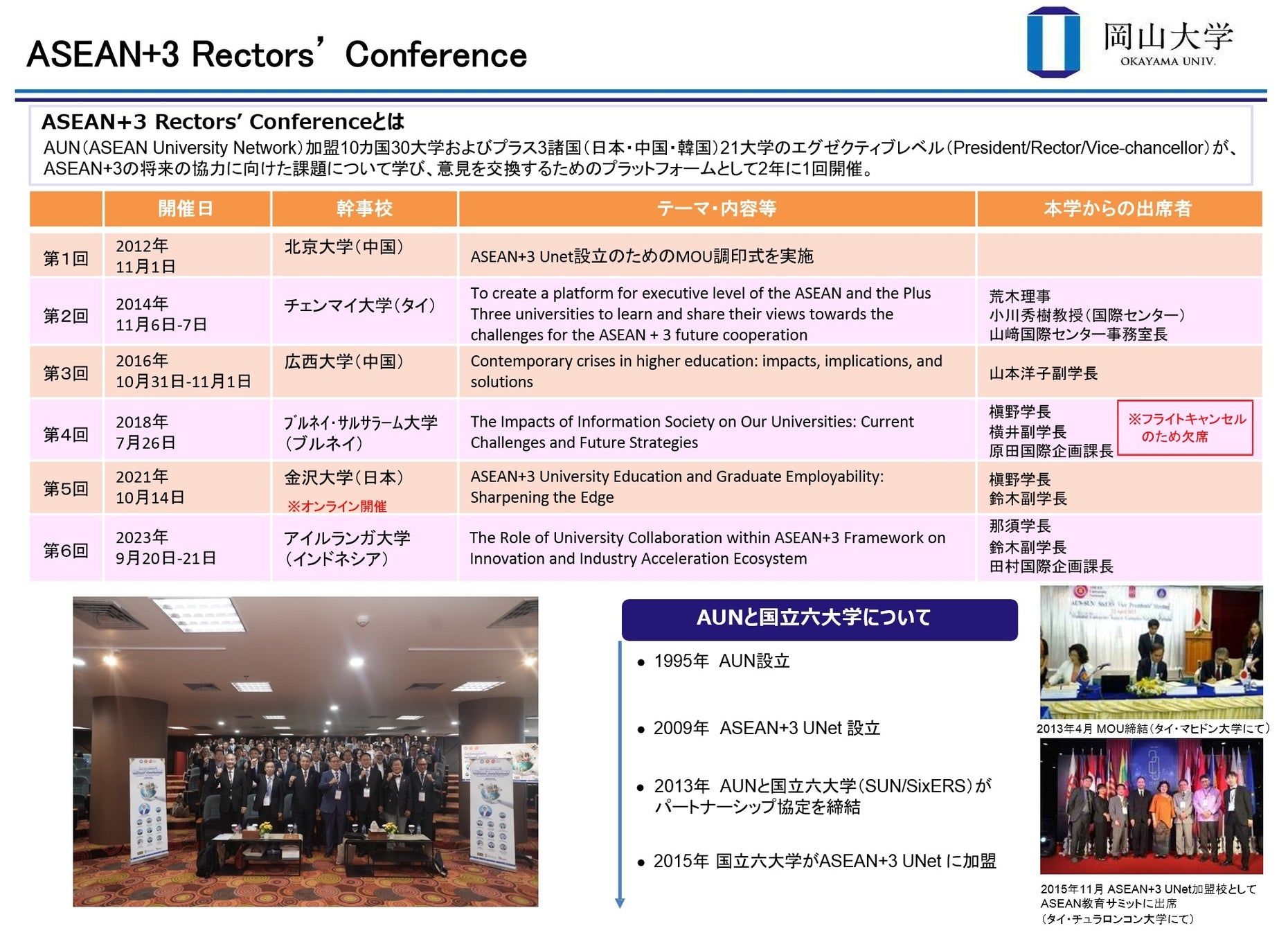 「ASEAN+3Rectors’ Conference」とは、ASEAN +3 University Networkのエグゼクティブレベルが集まり、将来の協力に向けた課題を学び、テーマに沿った意見交換を行う会議です。また、国立六大学はAUNとパートナーシップ協定を締結しており、この協定に基づき、さまざまな学生交流プログラムを実施しています。