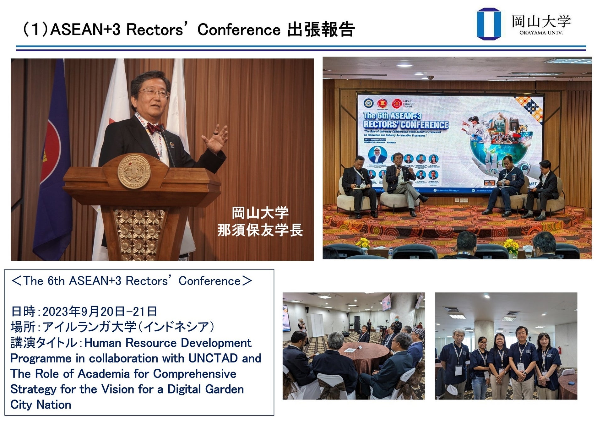2023年9月20日、21日にインドネシア・スラバヤで開催された第6回ASEAN+3(アセアンプラススリー)学長会議に那須保友学長が出席し、岡山大学の特徴的な国際交流プログラㇺと地域との連携プログラムについて講演を行いました。