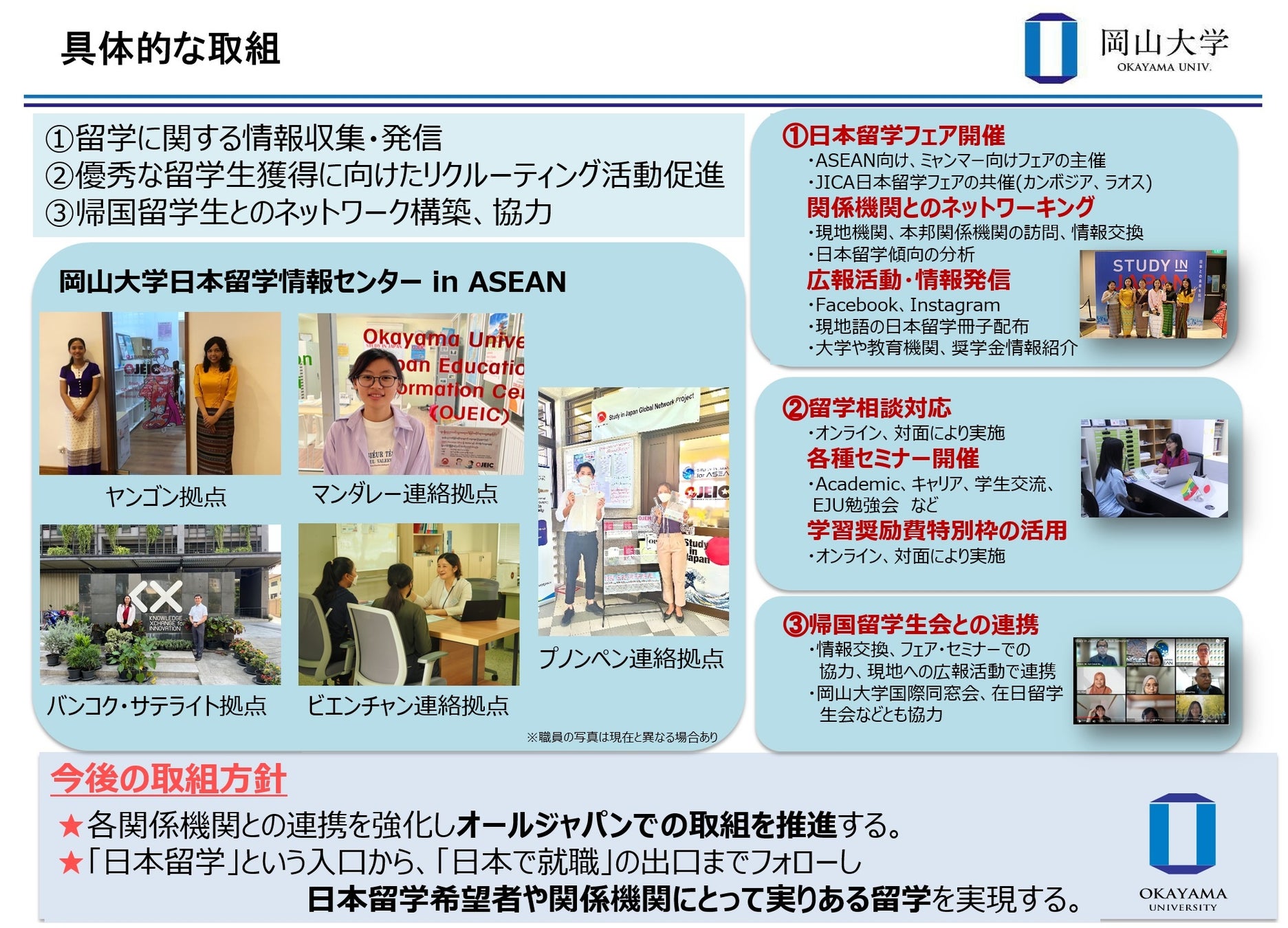 本事業の前身である、様々な機関の垣根を越えてオールジャパンで日本留学を促進するための司令塔となる留学コーディネーターを配置する「留学コーディネーター配置事業」が平成26年度より始まり、その後、当該事業が拡充・発展された形となっています。岡山大学は、全国5拠点のうち、ASEAN地域で採択されています。