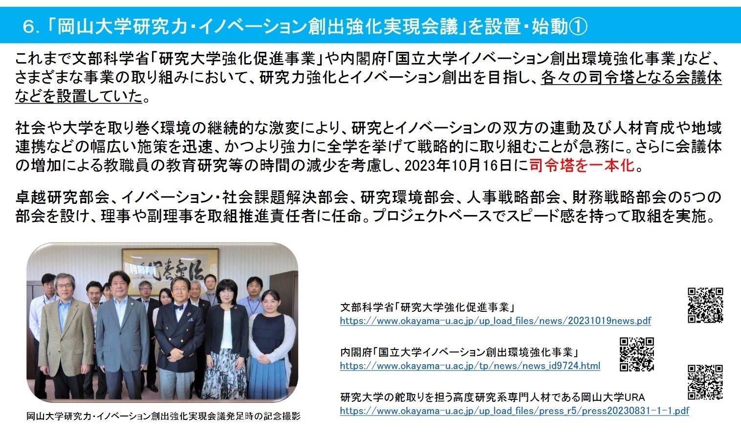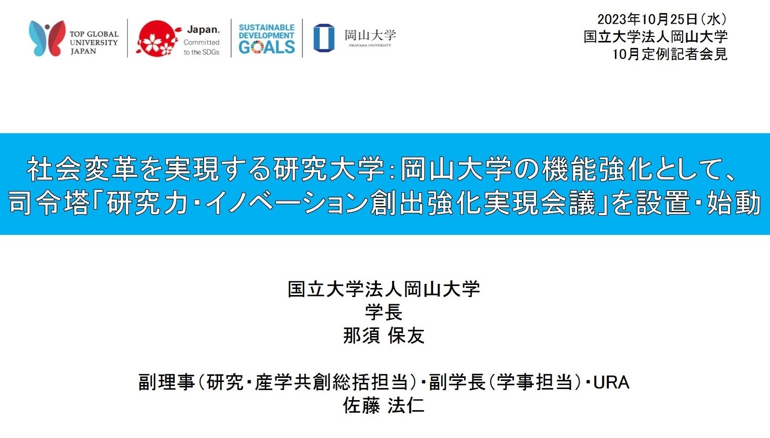 本件は、2023年10月25日に開催された「岡山大学10月定例記者会見」の学長発表「社会変革を実現する研究大学:岡山大学の機能強化として、司令塔『研究力・イノベーション創出強化実現会議』を設置・始動」において、詳細な説明がおこなわれました。