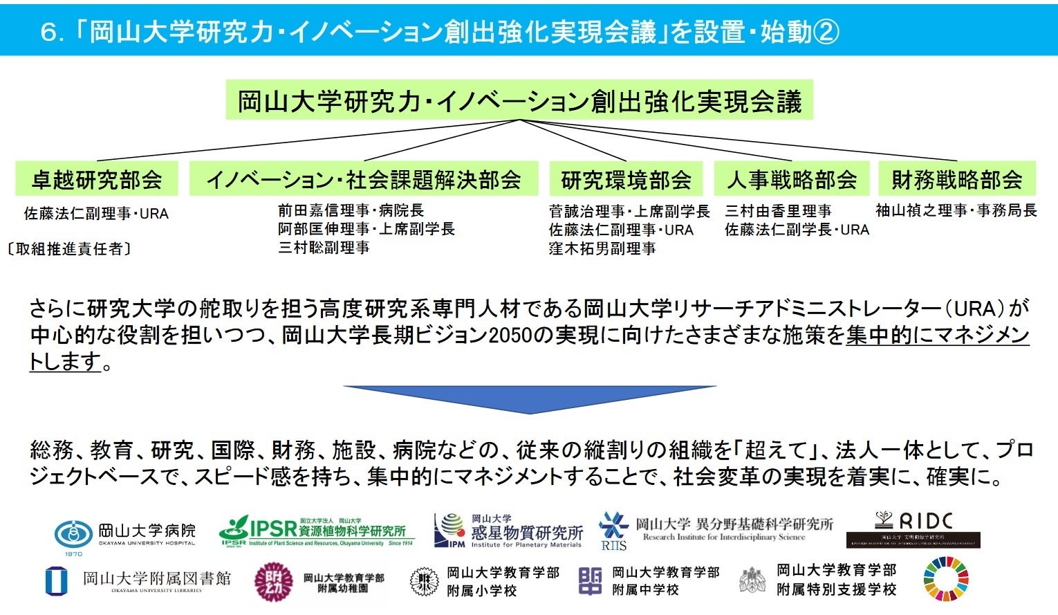 岡山大学はこれまで文部科学省「研究大学強化促進事業」や内閣府「国立大学イノベーション創出環境強化事業」などさまざまな事業の取り組みにおいて、研究力強化とイノベーション創出を目指し、各々の司令塔となる会議体などを設置していましたが、双方の連動及び人材育成や地域連携などの幅広い施策を迅速かつより強力に全学を挙げて戦略的に取り組むことが急務であること、さらに会議体の増加による教職員の教育研究等の時間の減少を考慮し、司令塔を一本化しました。