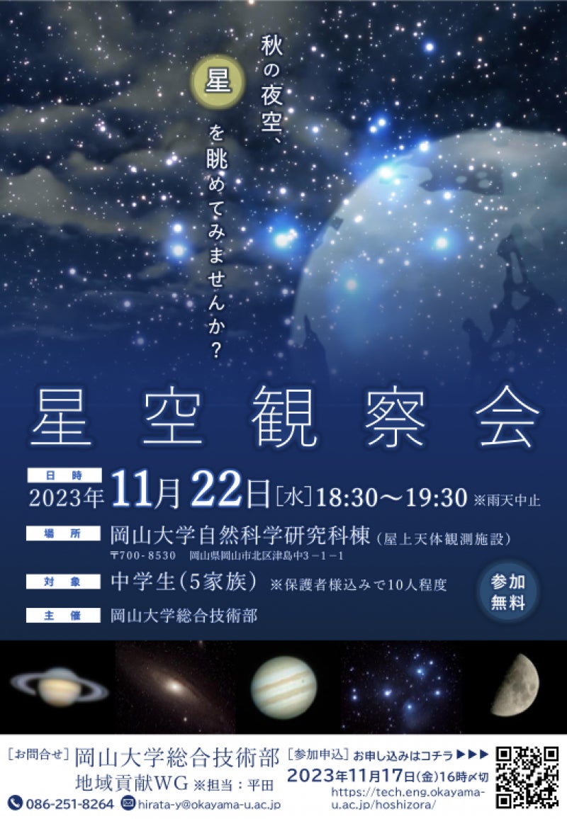 国立大学法人岡山大学(本部:岡山市北区、学長:那須保友)の総合技術部は、2023年11月22日に津島キャンパスの自然科学研究科棟屋上にある天体観測施設を使用して、中学生とその家族を対象とした「星空観察会2023」を開催しました。