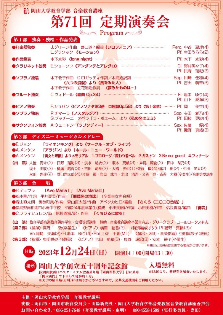 国立大学法人岡山大学(本部:岡山市北区、学長:那須保友)教育学部音楽教育講座の学生による演奏会です。今年度は3部構成で、1部がソロの演奏(学部4年生)、2部がディズニーミュージカル、3部は合唱という構成です。