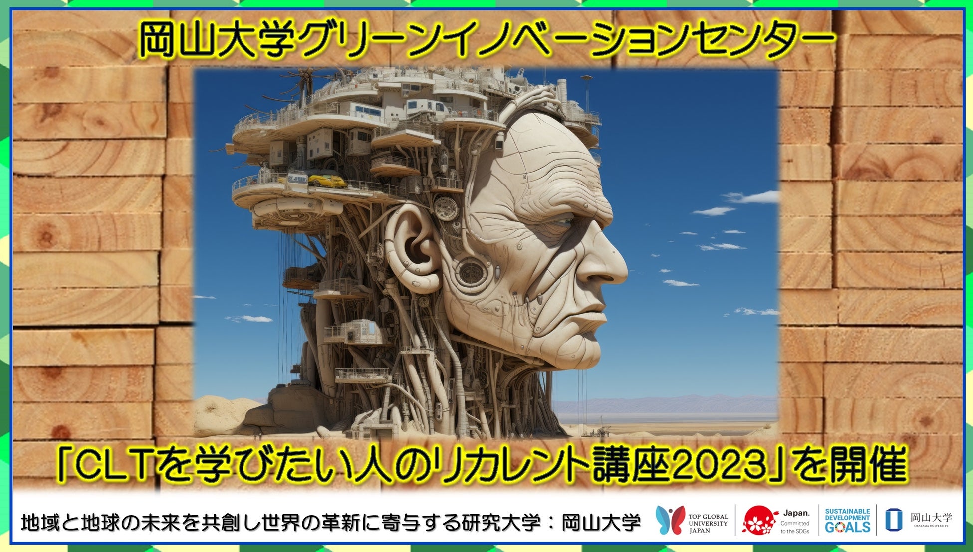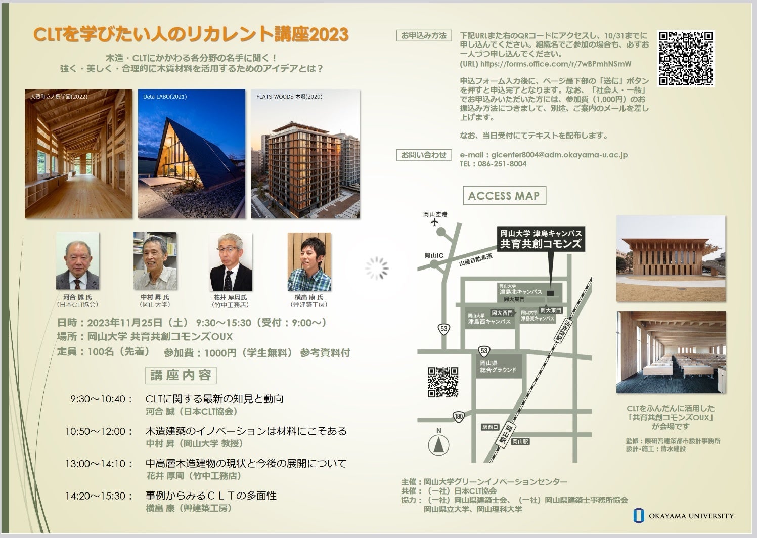 国立大学法人岡山大学(本部:岡山市北区、学長:那須保友)のグリーンイノベーションセンターは、2023年11月25日に一般社団法人日本CLT協会と共催で「CLTを学びたい人のリカレント講座2023」を本学津島キャンパスの共育共創コモンズ(オークス:OUX)で開催しました。