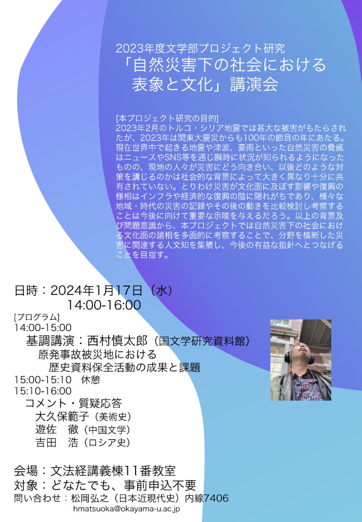 今回、2024年1月17日(水)に2023年度文学部プロジェクト研究 講演会「自然災害下の社会における表象と文化」の講演会を本学津島キャンパスの文法経講義棟11番教室で開催します。