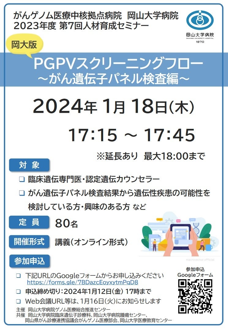 今回、がんゲノム医療に携わる医療従事者を対象として、がんゲノム医療中核拠点病院 岡山大学病院 2023年度第7回人材育成セミナー「岡大流PGPVスクリーニングフロー〜がん遺伝子パネル検査編〜」を、2024年1月18日(木)にオンラインで開催することとなりました。