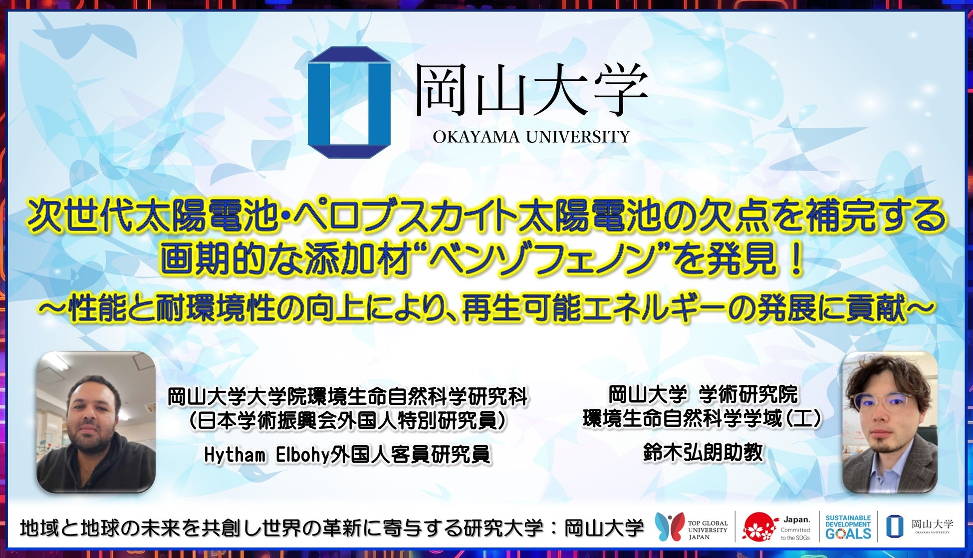 国立大学法人岡山大学(本部:岡山市北区、学長:那須保友)の岡山大学大学院環境生命自然科学研究科のHytham Elbohy外国人客員研究員(日本学術振興会 外国人特別研究員、Damietta University(エジプト)助教)、学術研究院環境生命自然科学学域(工)の鈴木弘朗助教、西川亘助教、林靖彦教授らは、Southern University of Science and Technology(中国)のAung Ko Ko Kyaw准教授と共同で、次世代太陽電池として期待されているペロブスカイト太陽電池の性能と安定性を向上する添加剤分子として“ベンゾフェノン”を発見しました。