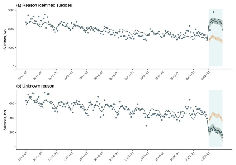 この傾向は全てのカテゴリー(家庭問題、健康問題、経済・生活問題、勤務問題、交際問題、学校問題、その他の理由)で一貫していました。理由不明の事例に関しては、2021年が月あたり平均485件の推移であったものが、2022年は過去の傾向に比べて167件(95%信頼区間-225~-110件)減少していました。