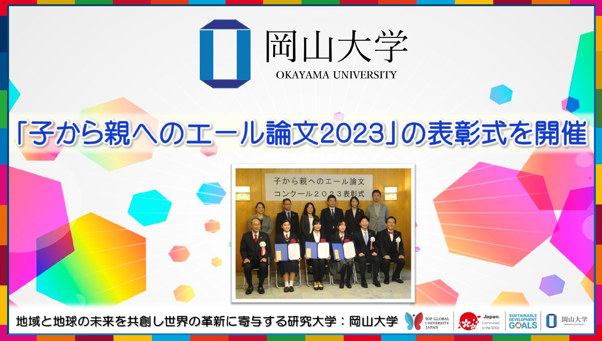 国立大学法人岡山大学(本部:岡山市北区、学長:那須保友)・岡山経済同友会・岡山県で組織するダイバーシティ推進実行委員会おかやま(会長:寺澤孝文・本学学術研究院教育学域教授)が募集した「子から親へのエール論文2023」の受賞者が決定し、2023年1月31日に岡山県庁(岡山市北区)にて表彰式・懇談会が開催されました。