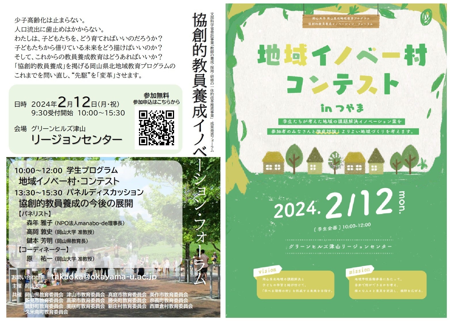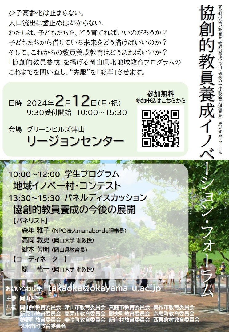 今回、同プログラムとして、岡山県教育委員会およびホームタウン市町村教育委員会と共催で「協創的教員養成イノベーション・フォーラム」を2024年2月12日(月・祝)にグリーンヒルズ津山 リージョンセンター(津山市大田)にて開催します。参加無料となっておりますが、参加申込(直前まで受付)が必要です。奮ってご参加ください!