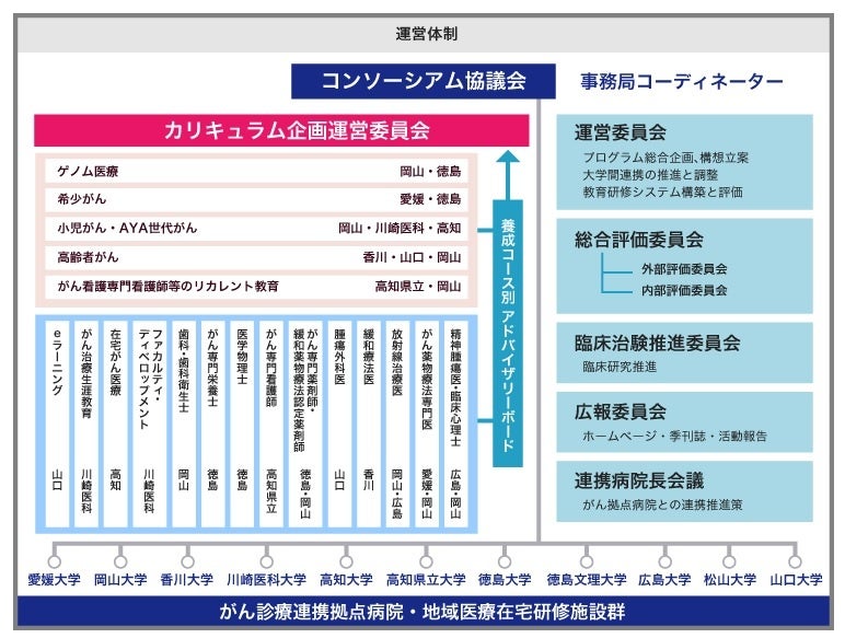 中国・四国広域がんプロ養成コンソーシアムは、中国・四国地域に位置する11大学がコンソーシアムを形成し、各大学院に多職種のがん専門医療人養成のためのコースワークを整備し、これに地域の35のがん診療連携拠点病院が連携することにより、広い地域にムラなくがん専門医療人を送り出すことを目的としています。